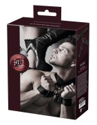 Collare e manette realizzati con robusti cinturini rivestiti in tessuto che sono regolabili all'infinito con un anello a D sul davanti è attaccato ai polsini con un moschettone