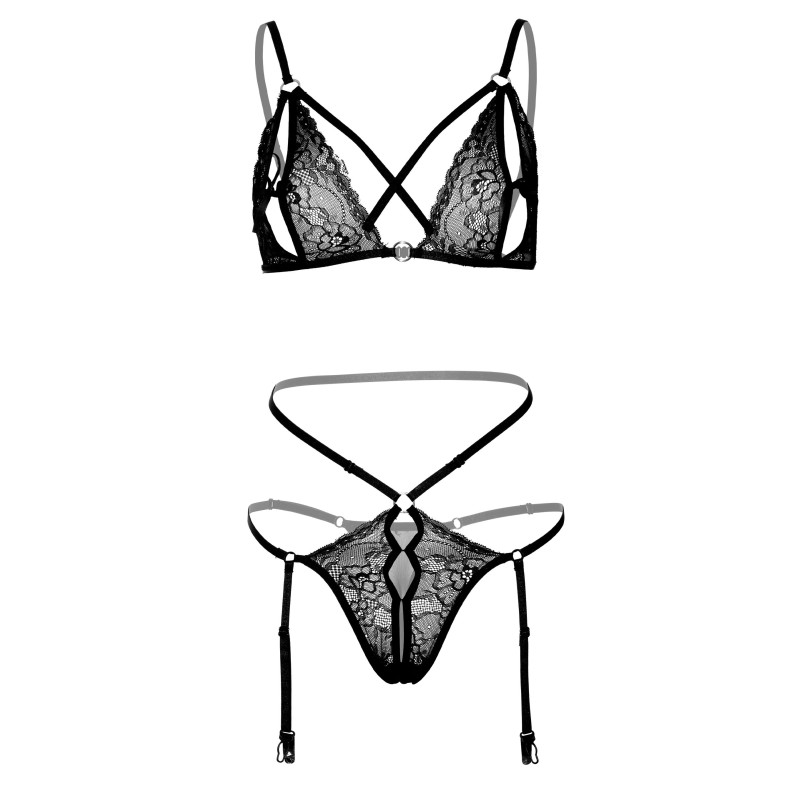 Reggiseno e mutandine peek-a-boo 2PC - Reggiseno peek-a-boo in pizzo floreale e reggicalze con spalline e dettagli ad anello in metallo. Fiocchi in raso per aprire le coppe, le spalline del reggiseno e il reggicalze sono regolabili per adattarsi al meglio al tuo corpo.