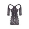 Bellissimo abitino in tessuto basato su rete con rifinture in pizzo nero florelae. Ai due lati è completamente aperto e coperto dalla sola stringa incrociata. Ideale nelle serate glamour o da indossare sotto ad un copri abito.