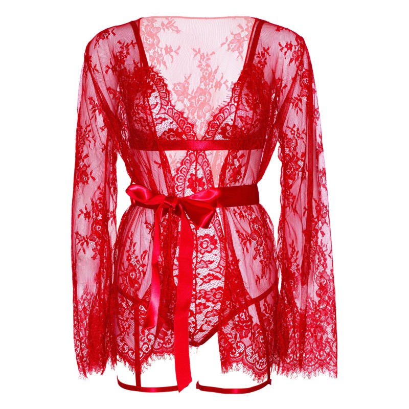 3 pezzi di orsetto con giarrettiera in pizzo ciglia con perizoma sul retro e spalline regolabili, vestaglia in pizzo e nastro.