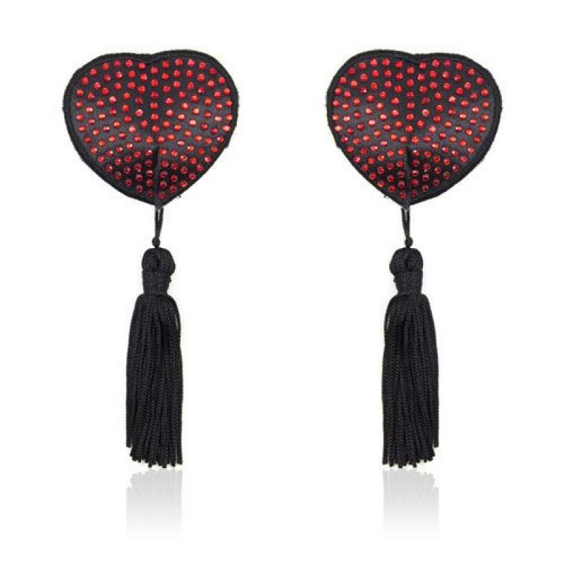 Copri capezzoli a forma di cuore con strass rossi e nastrini neri. Un prodotto della linea Fetish Art di Toys4Lovers