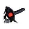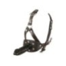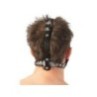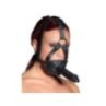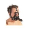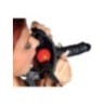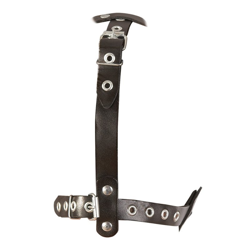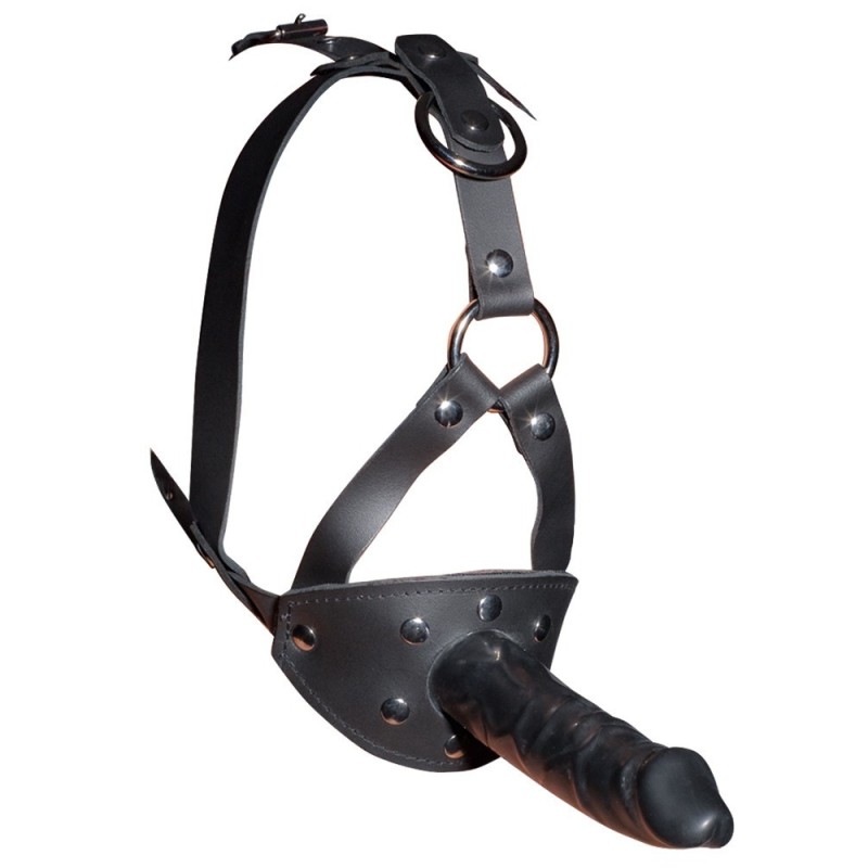 Sull'imbracatura regolabile nera c'è un bavaglio rosso (Ø 3,5 cm) all'interno e un magnifico dildo (13 cm di lunghezza, Ø 3,5 cm) all'esterno. Materiale: pelle crosta (pelle bovina), TPE, lattice.