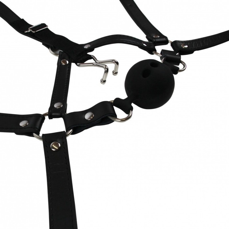Questa imbracatura BDSM intensificherà il tuo gioco di potere. Il ball gag allegato assicura sottomissione totale ai sottomessi ed agli schiavi, eliminando ogni possibilità di fuga. Realizzata in pelle, la maschera emana un'estetica audace e ruvida, esaltata dalle fibbie e dai dettagli in metallo. Per colore che cercano un' incontro ancora più intenso, è inculso un morsetto per il naso per limitare la capacità di respirare liberamente. le cinghie regolabili offrono una vestibilità sicura e confortevole, mentre il bavaglio a sfera mette a tacere efficacemente il tuo partner obbediente.