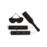 Set fetish di alta qualità composto da maschera per gli occhi, manette e paddle in pelle nobile con dettagli fluorescenti che brillano al buio! Maschera opaca per gli occhi su un'ampia fascia elastica per la testa. Manette con chiusura a fibbia regolabile (circonferenza da 18 cm a 28 cm). Paletta battente lunga 31 cm.