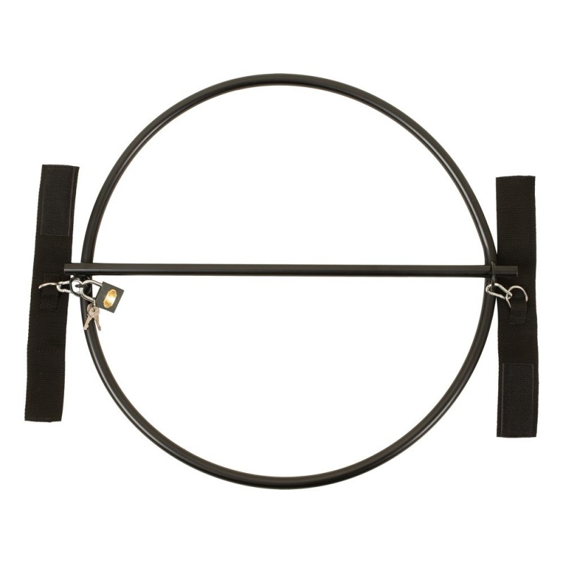 Anello bondage con manette - serratura e 3 chiavi incluse! L'anello di contenimento (Ø 48,5 cm) è molto robusto e stabile con il suo spessore di materiale di 1,6 cm. La traversa (lunga 55 cm) viene spinta attraverso il piccolo anello laterale e bloccata all'altro anello laterale con la serratura. Le cinghie delle manette antistrappo sono anche saldamente attaccate agli anelli laterali. Le cinghie delle manette sono larghe 5 cm e regolabili in circonferenza con chiusure in velcro.