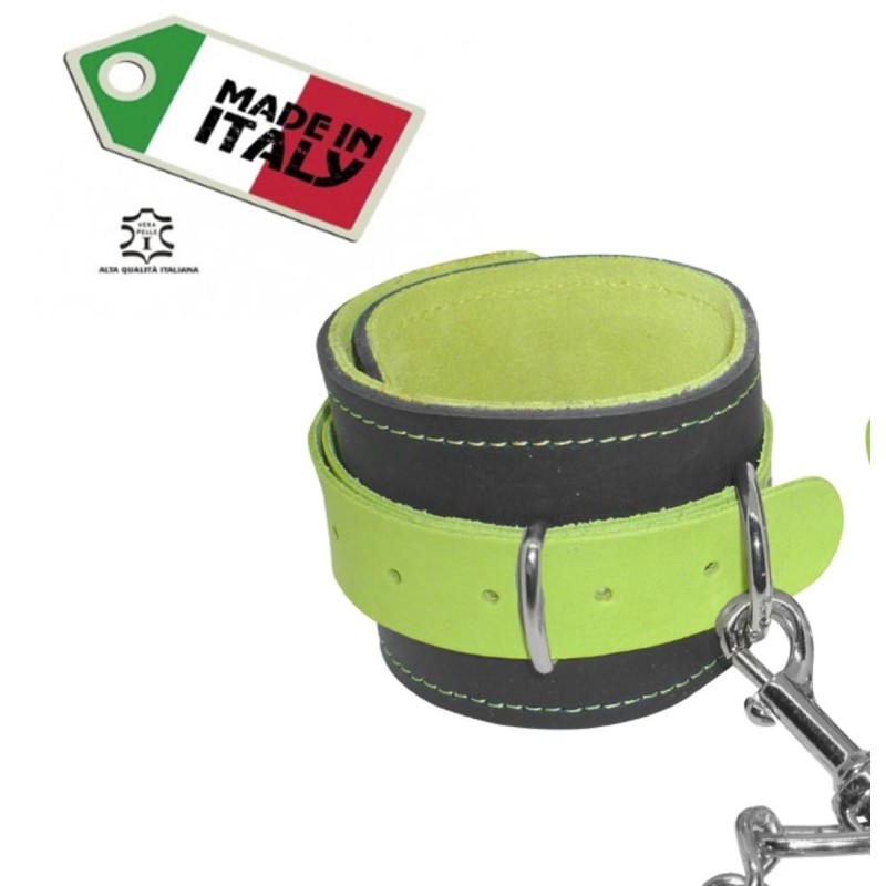 Cavigliere in vera pelle (con interno scamosciato per un maggior comfort)unite da un moschettone in ferro nichelato. Prodotto artigianale 100% Made in Italy.