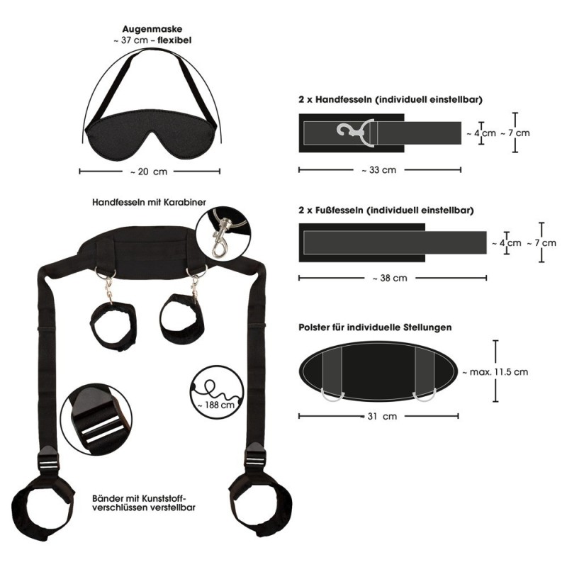 Per un bondage efficace su tutto il corpo! Bondage combinato di Bad Kitty che coinvolge collo/collo, mani e piedi. Polsini di contenzione rivestiti internamente in morbido peluche e regolabili con robuste chiusure in velcro per una vestibilità perfetta. Le cinghie di contenimento delle cavigliere sono regolabili in lunghezza. Le manette sono staccabili dal polsino con moschettoni. Maschera per gli occhi inclusa.