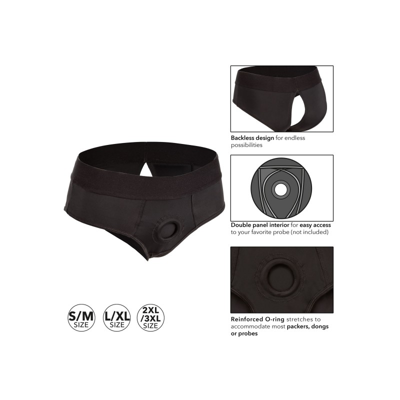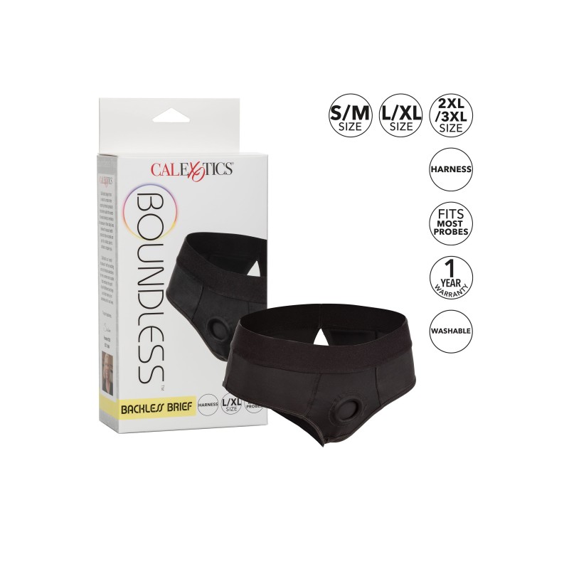 Il Boundless Backless Brief è un'imbracatura ultra-confortevole, realizzata come uno slip backless risquadrato, con prestazioni potenti e comfort in mente. Questa audace imbracatura è dotata di un girovita extra-largo, di un morbido tessuto elasticizzato e di un O-ring rinforzato per il massimo sostegno. Il resistente O-ring rinforzato si allunga per accogliere il vostro packer, vibratore o dildo preferito. Grazie al design aderente, questa imbracatura comfort può essere indossata discretamente sotto i vestiti. Godetevi il piacere in due grazie al doppio pannello interno per un facile accesso alla vostra sonda preferita. Sia i principianti che gli utenti esperti ameranno il piacere senza frustrazioni con questa imbracatura facile da indossare. Basta fissare la sonda preferita, infilare l'audace slip senza schienale e immergersi in una penetrazione appassionata o godersi un comodo abbigliamento per tutto il giorno. Facile da pulire, lavando in lavatrice e appendendo ad asciugare. Taglia da Large a X Large