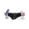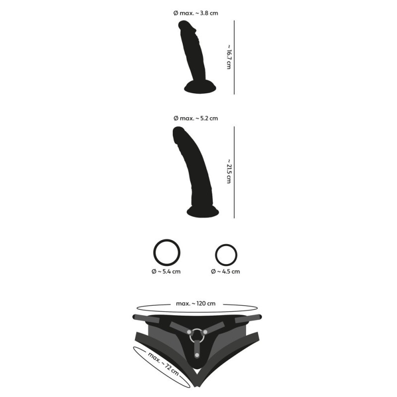 Imbracatura regolabile strap-on con delicati inserti di pizzo che includono 2 dildo e 2 anelli di fissaggio. Dildo e anelli di diverse dimensioni e intercambiabili. Entrambi i dildo in look pene-naturale con base a ventosa - possono essere usati anche da soli e anche a mani libere. La cintura strap-on è regolabile e allungabile (circonferenza fianchi regolabile fino a max. 120 cm, circonferenza cosce allungabile fino a max. 72 cm) e può essere utilizzata anche con altri vibratori/dodo con base a ventosa.