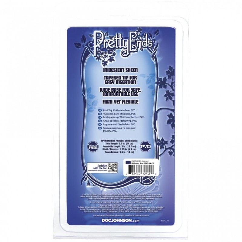 Iniziate il gioco anale con il butt plug Pretty Ends Iridescent da 5,5" di Doc Johnson. La forma liscia e affusolata è ideale per il primo inserimento, con una base svasata sicura e confortevole. Realizzato in PVC/TPR, materiale non ftalato sicuro per il corpo, che include la formula antibatterica Sil-A-Gel di Doc Johnson. Disponibile nei colori lavanda e blu notte. Prodotto orgogliosamente in America.