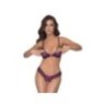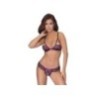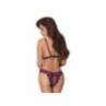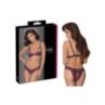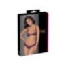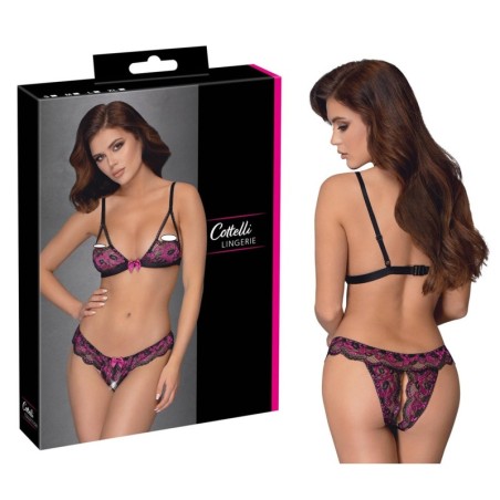 Reggiseno morbido e mutandine crotchless in morbido pizzo elastico bicolore con decorazione a fiocco sul davanti. Reggiseno con coppe a ¾ che coprono appena i capezzoli, schiena con chiusura a clip, spalline regolabili. Mutandine completamente aperte nel cavallo - anche sopra le natiche.