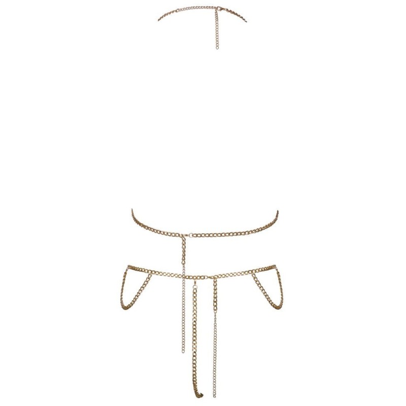 Look glamour con un tocco speciale! Bikini a catena color oro di Cottelli ACCESSOIRES con top a collo alto e stringhe. Lussuose catene sul davanti su seno, zona pubica e fianchi. Catena stimolante all'inguine fino a sopra il sedere. La catena al collo, la catena posteriore e la catena di stringhe possono essere regolate e personalizzate individualmente con chiusure a moschettone. Indossato da solo come lingerie per un look erotico o abbinato con stile a costumi da bagno e abiti aderenti, il bikini a catena glamour è sempre un eccitante richiamo per gli occhi!