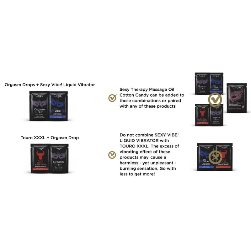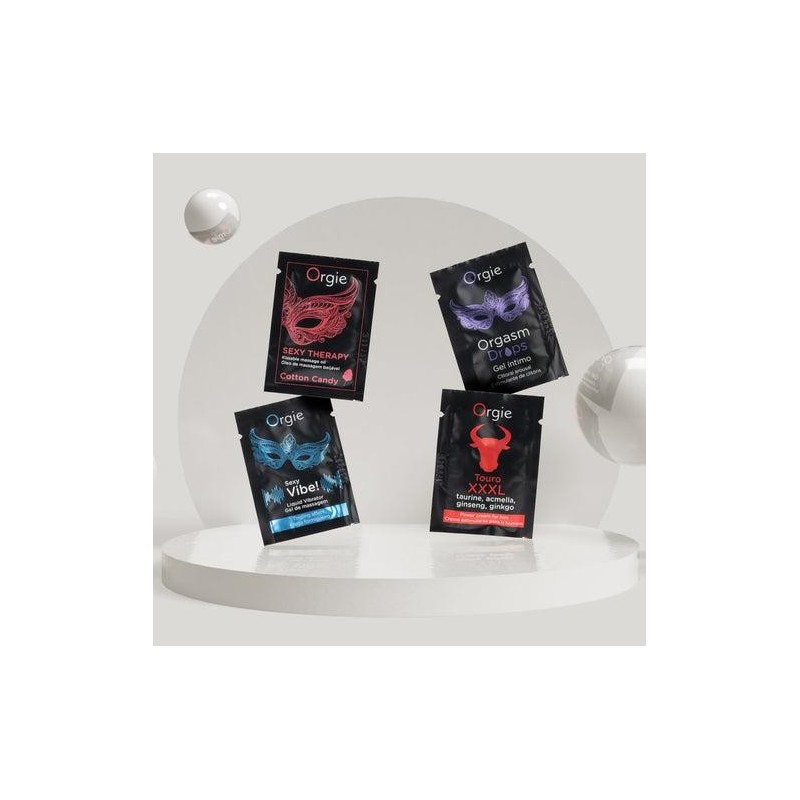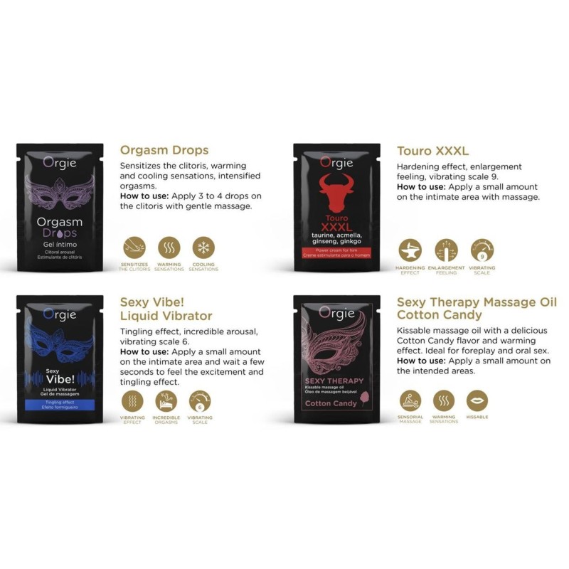 Il Play Set è una combinazione di 4 best-seller Orgie in formato bustina da 2 ml, pensata per essere la scelta ideale per una fuga romantica, un piccolo regalo o per provare questi prodotti Orgie. C'è un prodotto per lei, uno per lui, uno per la coppia e uno per i preliminari.