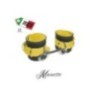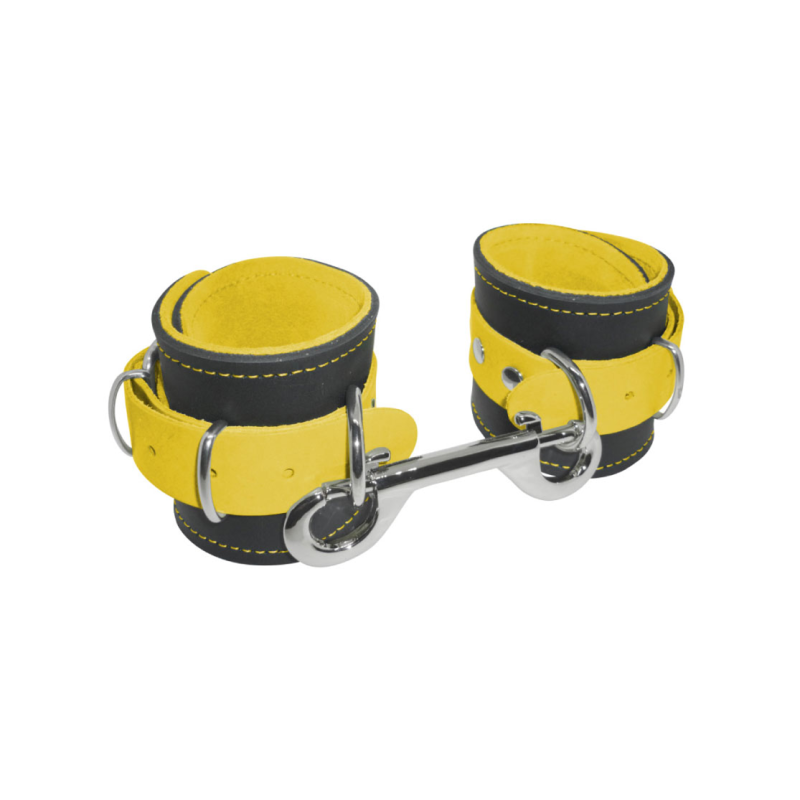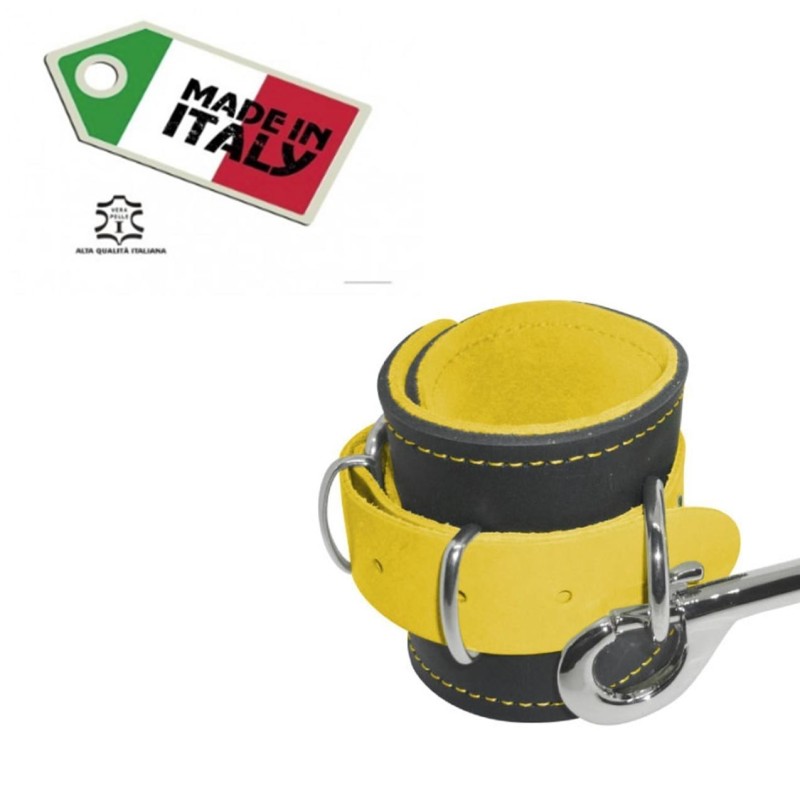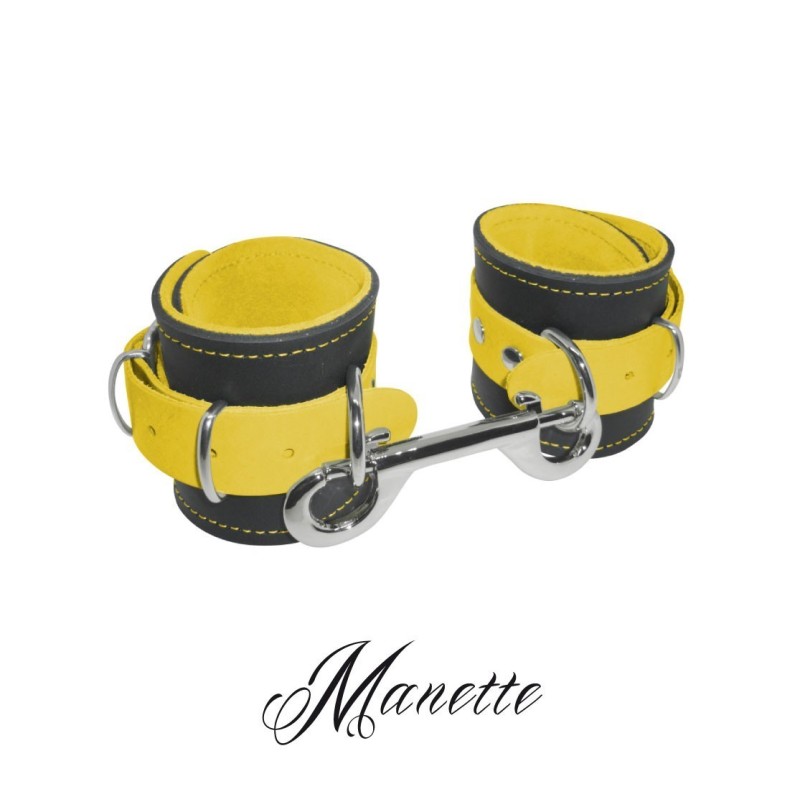 Manette in vera pelle (con interno scamosciato per un maggior comfort)unite da un moschettone doppio in ferro nichelato. Prodotto artigianale 100% Made in Italy.