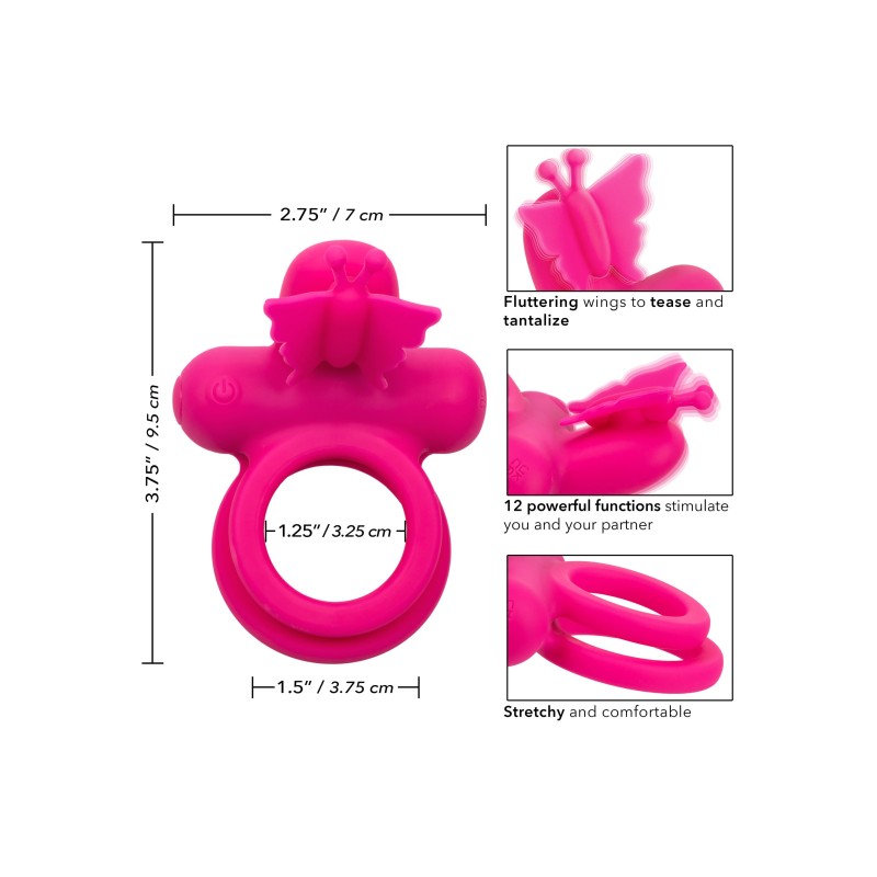 Il CalExotics Silicone Rechargeable Butterfly Dual Ring farà volare voi e il vostro amante verso l'estasi. Il potente stuzzicatore a farfalla è dotato di un anello potenziatore a doppio supporto, di una farfalla tremolante e di 12 funzioni di vibrazione che scuotono le ginocchia. Questo doppio anello stimolatore è perfettamente abbinato a un'audace farfalla con ali svolazzanti e antenne tremolanti. L'anello in silicone morbido e sicuro per il corpo migliora la resistenza e la circonferenza per far gemere il vostro amante per avere di più, di più, di più. L'anello doppio stretto massimizza la sensibilità e aumenta le sensazioni, permettendovi di godere di un piacere più lungo e potente. Raggiungete un piacere di livello superiore grazie a 12 funzioni di vibrazione e a uno stimolatore a farfalla che lascia entrambi i partner in uno stato di beatitudine orgasmica. Fate un tuffo in questo anello impermeabile e godetevi le potenti vibrazioni ovunque vogliate bagnarvi. Questo appassionato anello per il cazzo doppio ricorda esattamente come vi piace grazie a un chip di memoria all'avanguardia, in grado di riconoscere l'ultima funzione utilizzata. Ricaricate il vostro piacere in un attimo con un tempo di ricarica di 1,5 ore e godetevi fino a 80 minuti di gioco.