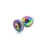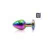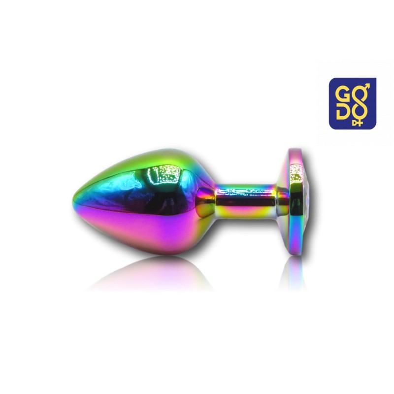 Questo plug medio in metallo colorato, prodotto da Godo di più, presenta una superficie liscia e colorata con un gioiello arcobaleno incastonato alla base.