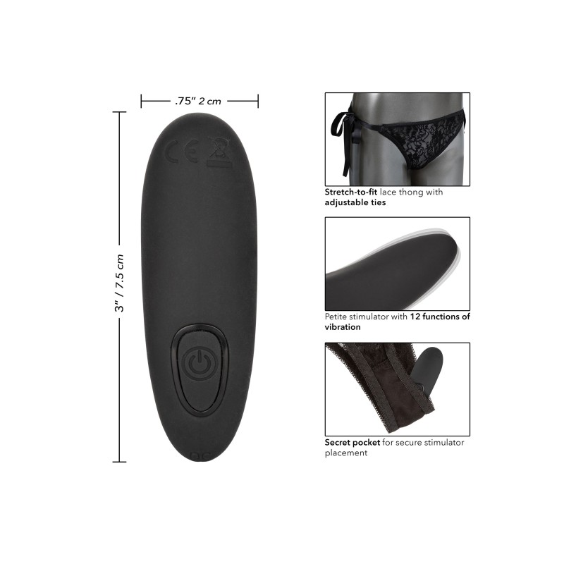 Concediti il tuo nuovo sporco piccolo segreto con il set di lacci del telecomando. Questo set sexy include un perizoma in pizzo elasticizzato da annodare, un collant curvo e un telecomando discreto con una portata fino a 10 m. Ogni volta che o dove ti porta la passione, le 12 intense funzioni di vibrazione di questo appassionato mini vibratore sono pronte per il gioco. Le mutandine in pizzo sexy ed elasticizzate presentano una tasca interna discreta con lacci laterali in raso per la perfetta tasca dello stimolatore.