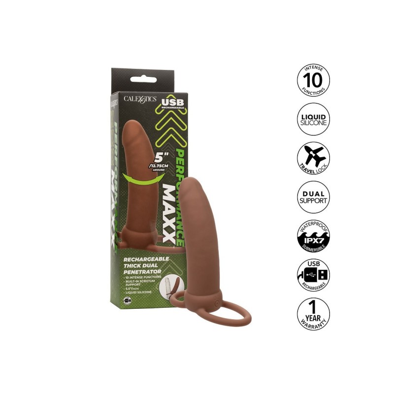 Introduciamo il Performance Maxx Rechargeable Thick Dual Penetrator, una sonda versatile che migliora le esperienze di doppia penetrazione. Ideale per incontri intensi, combina potenza, piacere e comfort, con 10 funzioni di vibrazione, pulsazione e escalation. La sua circonferenza migliorata, con un diametro di 5" / 12,75 cm, intensifica le sensazioni. Realizzato in silicone liquido, è morbido, liscio, resistente e impermeabile (classificato IPX7). L'anello scrotale integrato aggiunge supporto e stimolazione. Per comodità, riprende l'ultima funzione utilizzata e include una funzione di blocco per viaggiare. Ricaricabile tramite USB, si carica completamente in 1,5 ore, offrendo 60 minuti di piacere ad alta intensità o 90 minuti con impostazioni più basse. Sperimenta un piacere profondo con Performance Maxx Rechargeable Thick Dual Penetrator.
