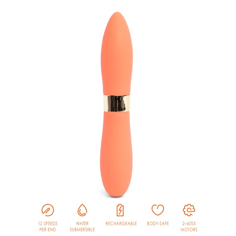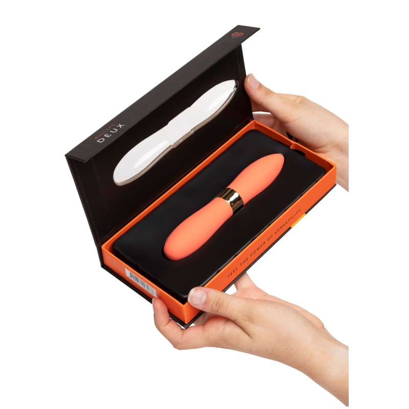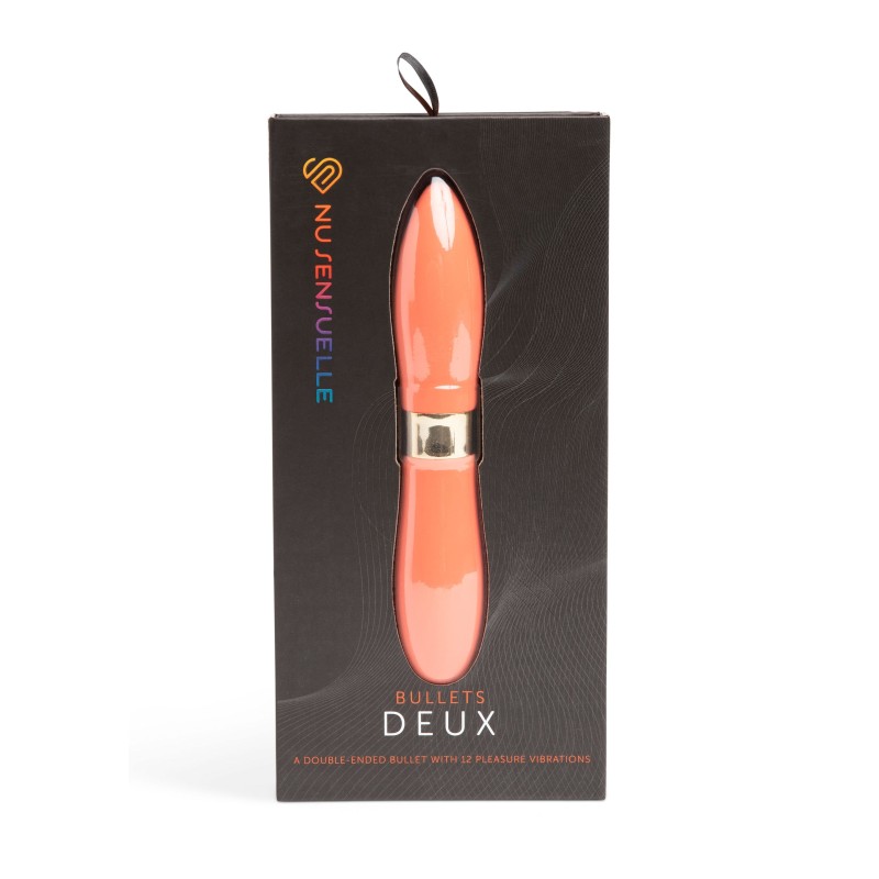 I Deux bulletS sono a doppia estremità, il che li rende multiuso. Ogni estremità del bullet sfoggia una forma distinta e contiene il proprio motore 60SX, che comanda 12 velocità di vibrazione. L'estremità appuntita del bullet è ottimale per la stimolazione puntuale, mentre la sua estremità più arrotondata fornisce una copertura massimizzata. Le possibilità sono infinite!