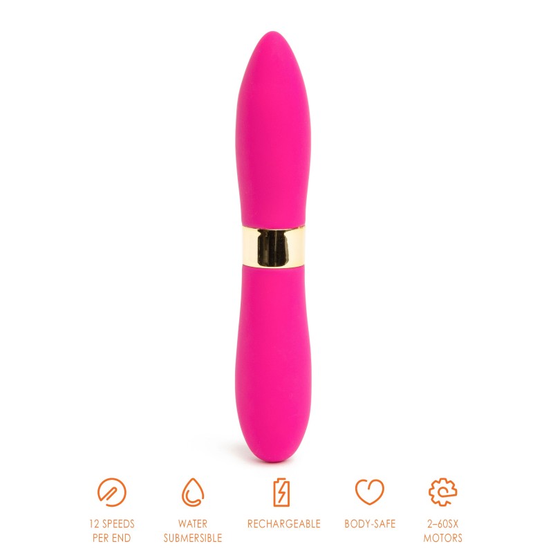 I Deux bulletS sono a doppia estremità, il che li rende multiuso. Ogni estremità del bullet sfoggia una forma distinta e contiene il proprio motore 60SX, che comanda 12 velocità di vibrazione. L'estremità appuntita del bullet è ottimale per la stimolazione puntuale, mentre la sua estremità più arrotondata fornisce una copertura massimizzata. Le possibilità sono infinite!