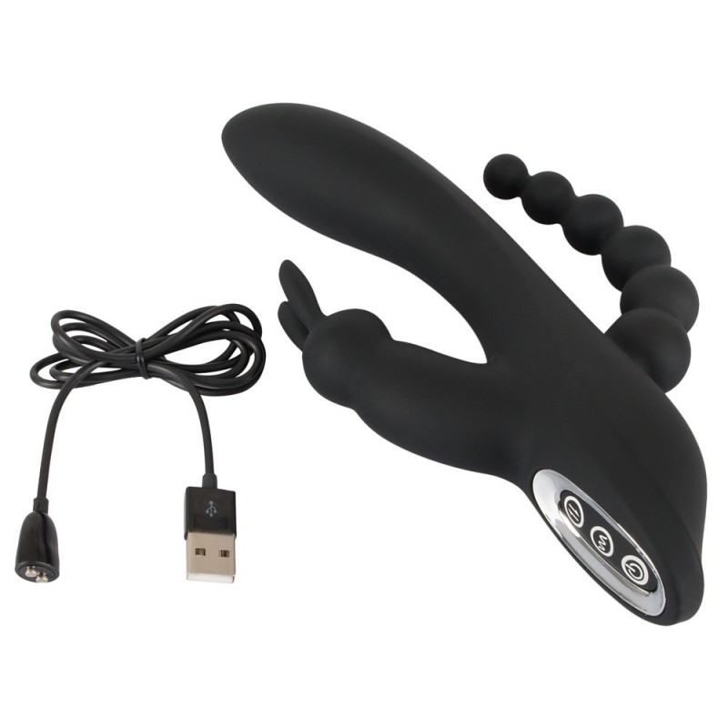 Vizia vagina, punto G, clitoride e ano allo stesso tempo! Vibratore con stimolatore clitorideo in design a coniglietto e stimolatore dell'ano in design a palla. 7 modalità di vibrazione nel fusto curvo con punta G-spot e 3 modalità di vibrazione nello stimolatore clitorideo possono essere comodamente controllate separatamente al tocco di un pulsante. Questo coccolatore a tutto tondo è coperto da una texture soft touch tutto intorno e fornisce una sensazione molto piacevole sulla pelle mentre si gioca e si coccola. Anche in ambienti umidi, perché il vibratore è impermeabile! Ricaricabile - cavo USB incluso. Lunghezza totale 20,8 cm; asta: lunghezza di inserimento 12,2 cm, Ø da 2,4 cm a 3,4 cm; stimolatore dell'ano: lunghezza di inserimento max. 10,5 cm, Ø da 0,6 cm a 2,3 cm Peso 211 g. Silicone, PU, ABS.