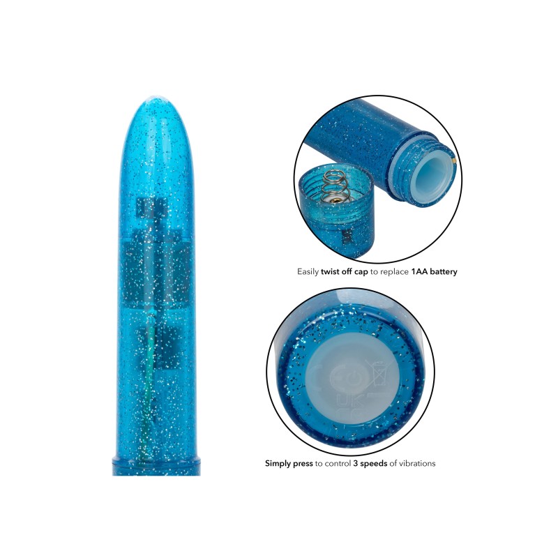 Che si tratti di un'immersione con l'amante o di una vaporosa sessione in solitaria, con questo vibratore vi attendono avventure seducenti. Immergetevi nell'estasi totale mentre questo vibratore orgasmico strofina, solletica e stuzzica. Il vibratore è realizzato in plastica ABS liscia con finitura scintillante e pulsante in silicone. Il piacere è alimentato da una singola batteria AA.