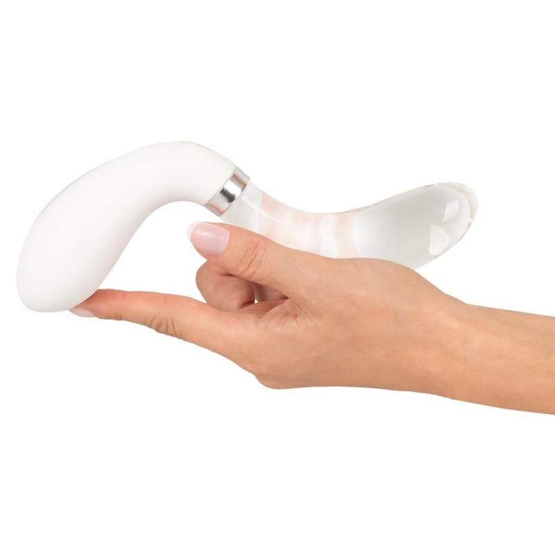 Una liaison peccaminosamente bella di vetro e silicone! Nobilmente elegante il vibratore Curve LED di Liaison che combina tutti i vantaggi di un vibratore in silicone e vetro. Il design squisitamente curvo e maneggevole con teste di stimolazione sagomate può essere utilizzato su entrambi i lati: un lato vibratore in silicone con texture morbida al tatto, l'altro lato vibratore in vetro borosilicato di qualità solida con sensuale illuminazione a LED nella punta. Un potente motore offre 10 diverse modalità di vibrazione, comodamente controllabili con un pulsante al centro del vibratore Curve LED. Le vibrazioni possono essere percepite intensamente da entrambe le estremità per massaggi e stimolazioni versatili all'interno e sul corpo, per il divertimento in solitaria o per fare l'amore in due. Il materiale di alta qualità, adatto al corpo, composto da vetro e silicone, scivola sulla pelle e nelle profondità intime come se fosse da solo. Grazie a queste superfici completamente lisce, il vibratore Curve LED è semplice e facile da pulire. Il vibratore in vetro può anche essere facilmente riscaldato o raffreddato per sofisticati giochi di temperatura. Ricaricabile - Cavo di ricarica USB incluso. Lunghezza totale 20,5 cm. Lunghezza di inserimento del vibratore in silicone 8,5 cm, Ø massimo 4,1 cm. Vibratore in vetro Lunghezza di inserimento 8,5 cm, Ø max. 3,4 cm. Peso 242 g. Silicone, PU, ABS, vetro.
