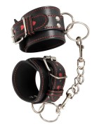 Accessorio Fetish sadomaso per giochi di ruolo BDSM sottomissione e costrizione. Manette colore nero con finiture di cuoricini e cuciture rosse. Fibbia per la regolazione e catena centrale dotata di moschettoni serve per unirle.