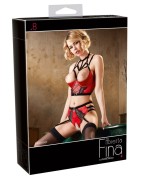 Sensuale bustier in raso con gancio leggermente imbottito e dettagli con spalline regolabili incluso colletto regolabile. Con inserti in pizzo semitrasparente e allacciatura decorativa sul busto. Un anello di strass nella parte anteriore della cintura completa l'aspetto. Lo slip abbinato, senza cavallo, ha un taglio in vita e bretelle regolabili e rimovibili. Ai fianchi è trattenuto da 3 elastici. Con un altro anello di strass in vita e inserti in pizzo semitrasparente sul davanti e sul retro.