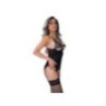 Reggicalze in pizzo e rete sotto il seno e perizoma coordinato - Reggicalze in pizzo e rete con spalline e coppe sotto il seno birichine e dettaglio buco della serratura sul davanti. Viene fornito insieme a un perizoma in rete abbinato. La giarrettiera a cami ha reggiseno e spalline regolabili.