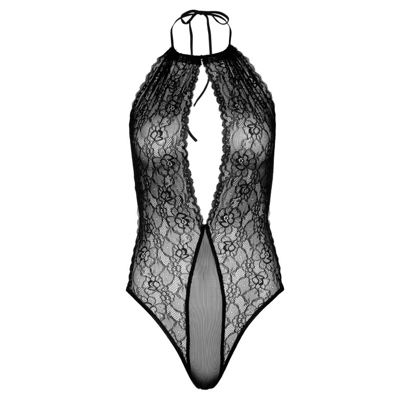 Orsacchiotto di pizzo con buco della serratura - Orsacchiotto profondo con spago e fondoschiena aperto, realizzato in pizzo delicato, rete trasparente e cinghie elastiche per la migliore vestibilità per le tue curve. Sexy dettaglio anello in metallo sul retro.