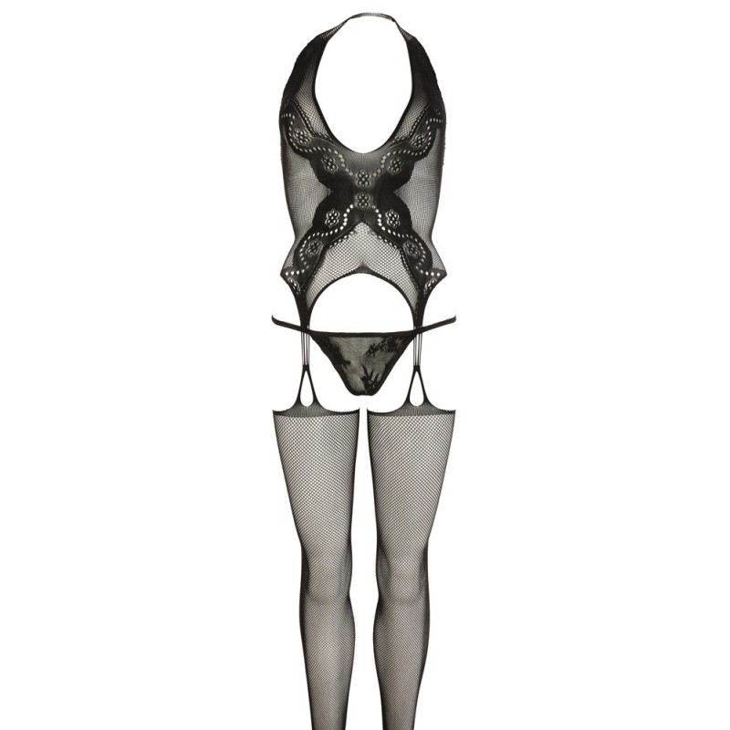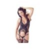 Sexy tutina in un pezzo unico. Elasticizzata, su base a rete rifinita in pizzo. Bellissimi gli intagli. Il top si collega alle calze con una delicata stringatura sia davanti che sul retro. Ottima vestibilità ed aderenza.