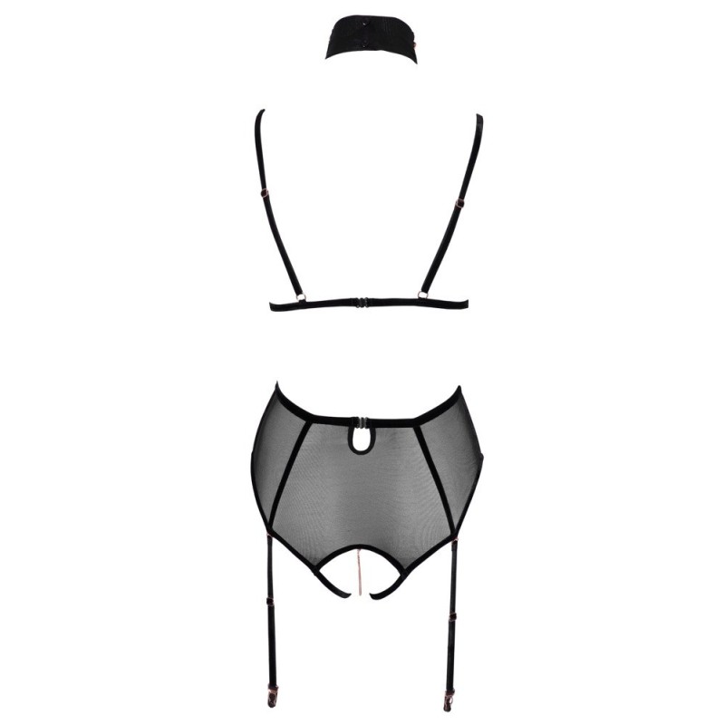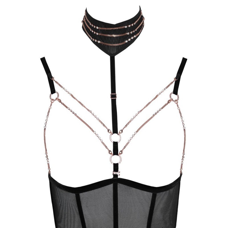 Elegante e invitantemente rivelatore! Body senza seno di Abierta Fina con cavallo completamente aperto in powernet con strisce di velluto elastico ed elementi di gioielleria color oro rosa. Cinghie e bretelle regolabili, bretelle anche rimovibili. Cinghia regolabile del décolleté con collana ornata di catene (con chiusura a bottone) anch'essa rimovibile, così come le catene del seno con piccoli moschettoni e la catena inguinale con anello decorativo. Tutte le catene sono inoltre decorate con piccoli strass. Vista posteriore in look a due pezzi con due chiusure a clip su reggiseno e mutandine/cintura in vita. 90% poliammide, 10% spandex. Senza calze.