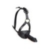 Sull'imbracatura regolabile nera c'è un bavaglio rosso (Ø 3,5 cm) all'interno e un magnifico dildo (13 cm di lunghezza, Ø 3,5 cm) all'esterno. Materiale: pelle crosta (pelle bovina), TPE, lattice.