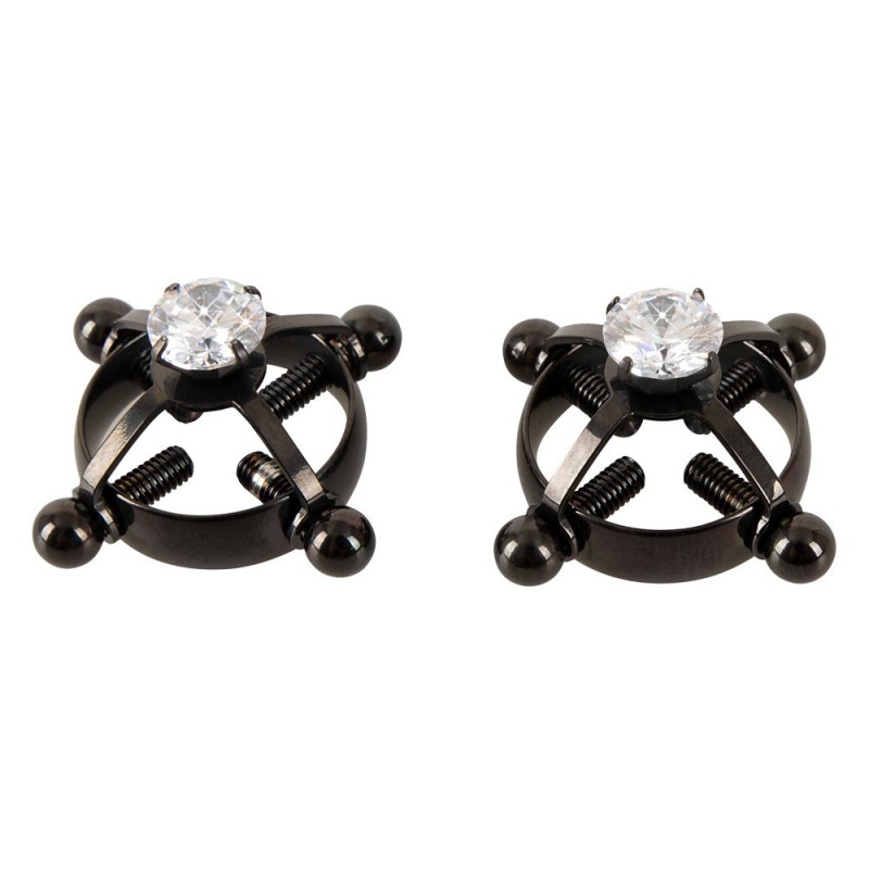 Questi due morsetti per capezzoli leggeri come una piuma Nipple Jewellery Shiny Star di Bad Kitty tengono i capezzoli in una presa da sensualmente delicata ad eccitante grazie a 4 viti di regolazione ciascuno. Con le loro gemme scintillanti, i morsetti di metallo nero sembrano molto eleganti e completano l'illusione di un vero piercing.