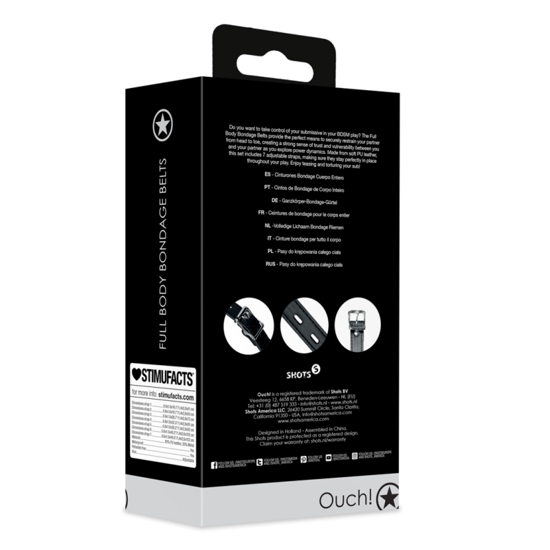 Volete prendere il controllo del vostro sottomesso nei vostri giochi BDSM? Le cinghie Full Body Bondage forniscono il mezzo perfetto per immobilizzare il vostro partner dalla testa ai piedi, creando un forte senso di fiducia e vulnerabilità tra voi e il vostro partner mentre esplorate le dinamiche di potere. Realizzato in morbida pelle PU, questo set comprende 7 cinghie regolabili, per garantire che rimangano perfettamente in posizione durante il gioco. Divertitevi a stuzzicare e torturare il vostro compagno!