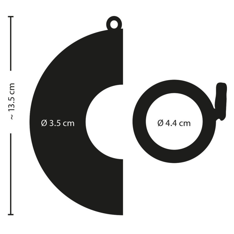 Lunghezza totale 13,5 cm, lunghezza della gabbia 12 cm, Ø 3,5 cm. Anello del testicolo Ø 4,4 cm. Peso 193 g. Metallo.
