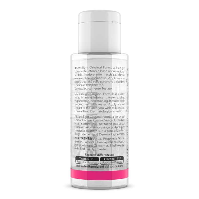Sensilight Original è un lubrificante intimo a base acquosa, specifico per l'idratazione e la lubrificazione vaginale o anale prima della penetrazione. Non unge e non contiene grassi. Grazie alla sua esclusiva formulazione ricca di preziosi elementi attivi naturali Sensilight previene fastidi, bruciori ed irritazioni tipiche delle zone intime sottoposte a stress naturali e prolungati. Il prodotto é idrosolubile, compatibile con profilattici ed accessori sessuali. Prima della penetrazione stendere un leggero velo di prodotto sulla parte interessata. Prodotto "Made in Italy" dermatologicamente testato.
