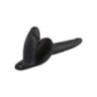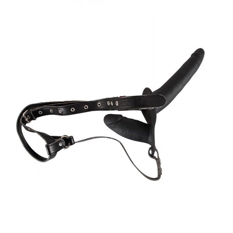 Fallo strap on imbragatura indossabile composta da un doppio fallo  il primo e lungo 15 cm diametro da 2,3 a 3,2 cm mentre l'altro dildo e lungo 8,5 cm e ha un diametro di 2,2a 3 cm . realizzato in silicone e l'imbragatura in pelle ecologica.