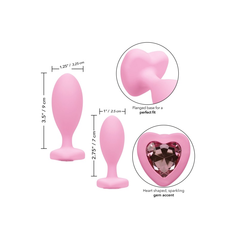 Assecondate le vostre fantasie più cattive e apritevi a un eccitante gioco anale con il First Time Crystal Booty Duo. Questo kit pronto per il gioco comprende 2 plug anali graduati con base in cristallo a cuore, sonda dal design sinuoso e corpo in silicone morbido. Per godere di tutto ciò che l'esaltante mondo del gioco anale ha da offrire, è necessario un addestramento per garantire la totale sicurezza e soddisfazione. Ogni sonda del nostro kit aumenta gradualmente in lunghezza e circonferenza per un piacere superbo a qualsiasi livello di gioco anale. Mentre ogni aumento dell'allenamento espande i vostri orizzonti, innamoratevi della scintillante base ornata di gemme a cuore per una stimolazione vaporosa, un inserimento senza sforzo e una rimozione delicata. Le sonde flessibili sono realizzate in silicone liscio e senza cuciture. Questo materiale sicuro per il corpo non è profumato e non contiene ftalati, per rendere felici e sani i vostri punti più sensibili.