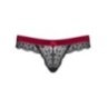 Piccolo seduttore sensuale! Perizoma Rio in morbido pizzo nero elastico con cintura in velluto bordeaux, decorato con un piccolo fiocco. 90% poliammide, 10% spandex.