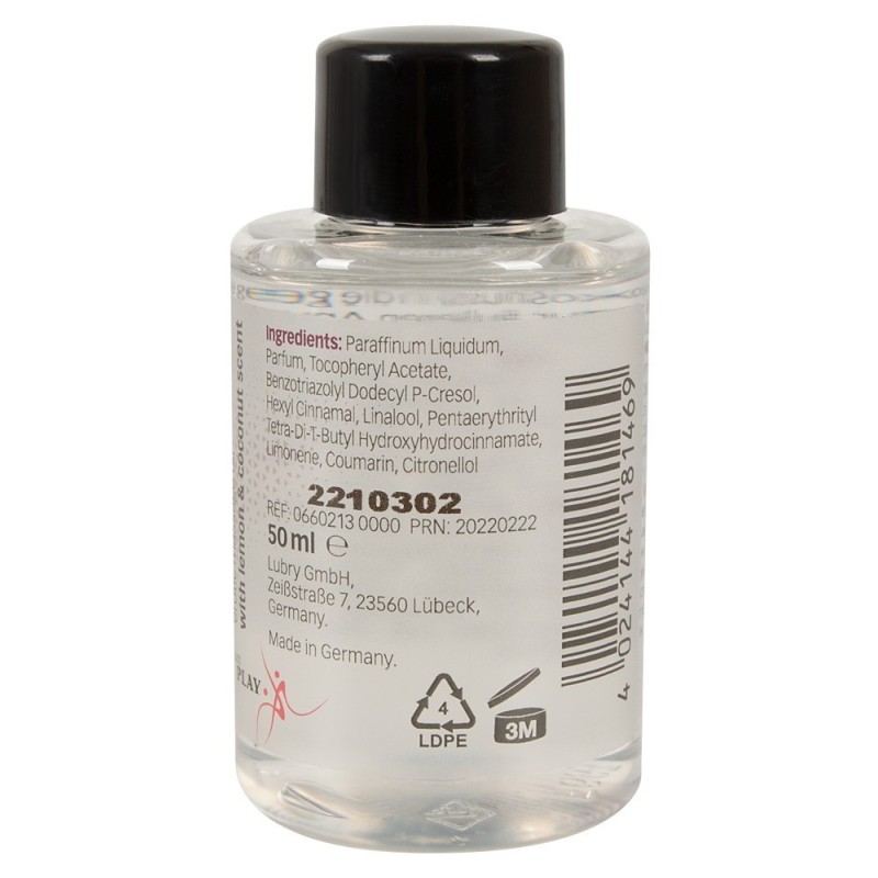 L'olio per massaggi erotici Just Play ha un'eccitante profumazione esotica al limone e cocco che coccola tutti i sensi e risveglia gli stati d'animo erotici durante un massaggio con il partner. Molto economico. Vegano. 50 ml. Solo per uso esterno.