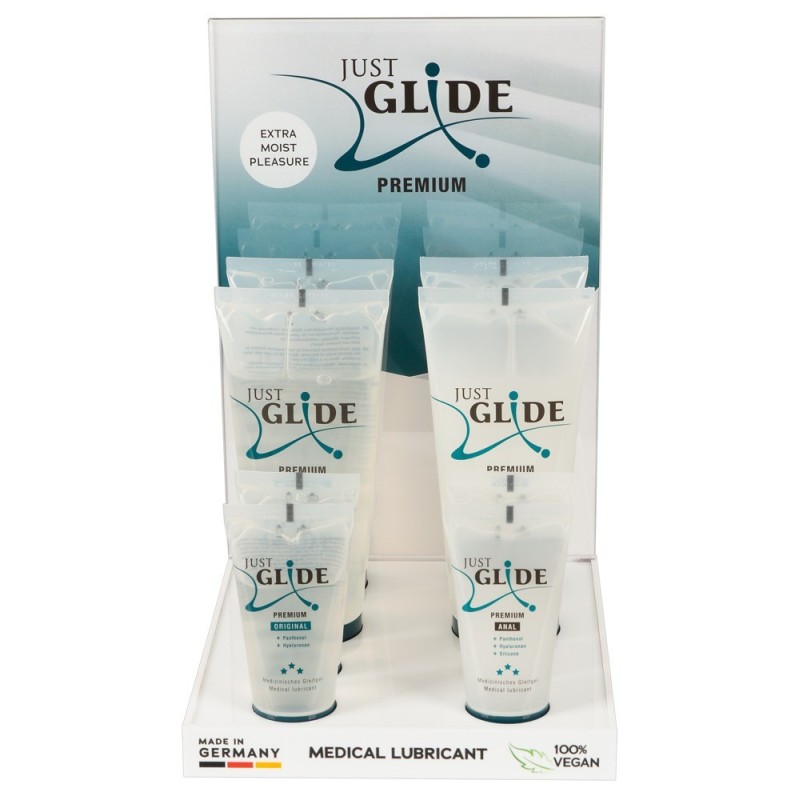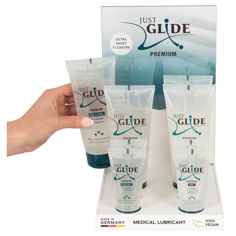 Entrambe le varietà premium a base d'acqua di Just Glide sono 100% vegane. Lavabile. Preservativo in lattice sicuro. Inodore e insapore. Il pantenolo contenuto ha un effetto lenitivo e rigenerante della barriera cutanea. L'acido ialuronico ha un effetto idratante e crea una consistenza extra liscia del gel. Il Premium è senza olio, mentre il Premium Anal contiene olio di silicone, che contribuisce all'estrema lubrificazione.