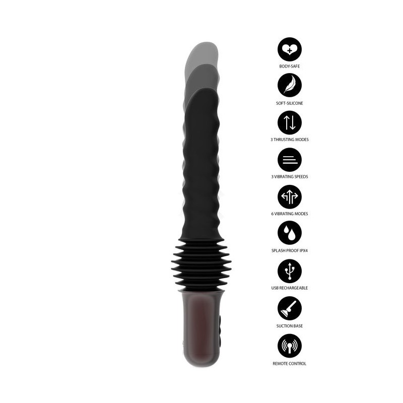 Il vibratore anale Power Thrusting è sapientemente realizzato per un inserimento morbido e una penetrazione intensa e profonda, con una base di aspirazione regolabile per giocare a mani libere. Con una capacità di spinta fino a 5 cm, questo vibratore misura 32 cm e si estende fino a 37 cm con una spinta completa. Attivate il motore incredibilmente potente, che eroga fino a 80 spinte al minuto attraverso l'albero e abbandonatevi alle vibrazioni sconvolgenti e rimbombanti che vi guideranno verso un orgasmo esplosivo. Preparatevi a un climax di sensazioni senza precedenti che vi lascerà senza fiato. Realizzato al 100% in puro silicone, questo vibratore garantisce durata e comfort, offrendo al contempo un'ampia gamma di modalità di vibrazione per un'esperienza esaltante. Scatenate le vostre fantasie più sfrenate con il vibratore anale Power Thrusting e sbloccate nuovi livelli di piacere che vi faranno desiderare di più.