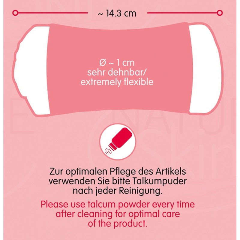 Questo eccitante seduttore vi promette un piacere doppio, perché questo masturbatore color pelle nasconde due aperture del piacere! Decidete voi stesse cosa desiderate: l'invitante apertura della vagina con un canale del piacere scanalato dietro di essa o l'apertura dell'ano con un canale del piacere scanalato. Il diametro del canale del piacere si adatta sempre perfettamente grazie al materiale elastico simile alla pelle. E qualunque sia la vostra scelta, il manicotto nero testurizzato vi assicura sempre una presa salda sul masturbatore.