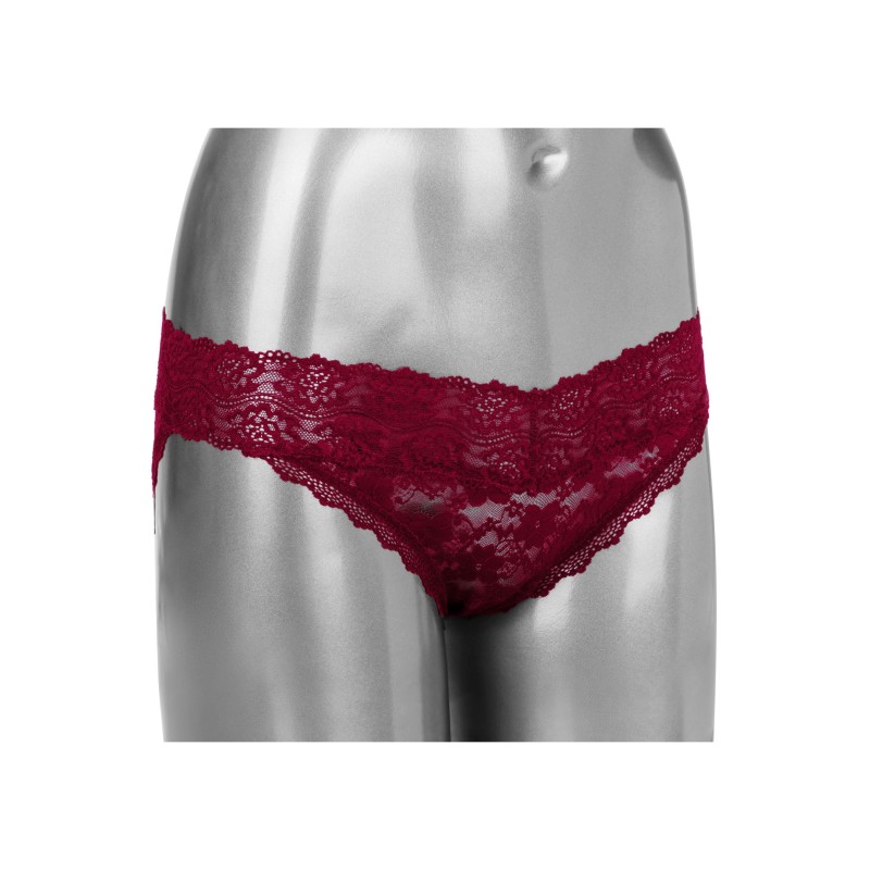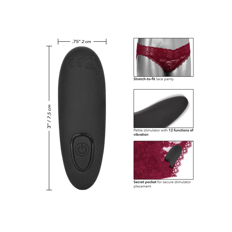 Telecomando e ricaricabile - da usare da solo o con un partner! Stimolatore piccolo e curvo che si adatta comodamente alla mutandina di pizzo ● Mutandina di pizzo elasticizzata con tasca discreta per un perfetto posizionamento dello stimolatore ● Mutandina di pizzo lavabile in lavatrice ● 12 intense funzioni di vibrazione, pulsazione ed escalation ● Il chip di memoria all'avanguardia riprende dall'ultima funzione utilizzata ● Lo stimolatore impermeabile può essere usato indipendentemente dal telecomando ● Facile controllo a pulsante ● Portata estesa di 32,75'/10 m ● Certificato rosso incluso ● USB ricaricabile (stimolatore e telecomando) - doppio cavo di ricarica incluso