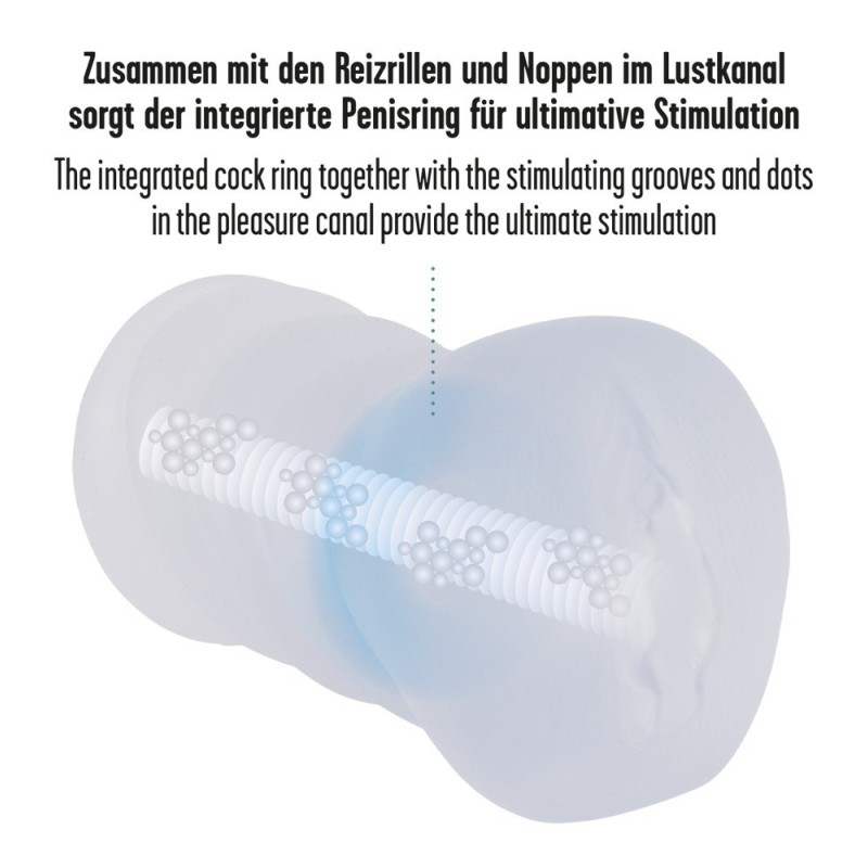 Masturbatore trasparente in look vagina. Il masturbatore elastico fatto di materiale simile alla pelle è dotato di scanalature e nodi di stimolazione distintivi all'interno, che forniscono un massaggio intenso ed efficace per l'orgasmo durante l'handjob. L'anello elastico per il pene integrato all'interno prende il pezzo migliore bello e stretto "nella pinza" per una sensazione di presa intensa. Il masturbatore è anche aperto sul retro per una facile pulizia.
