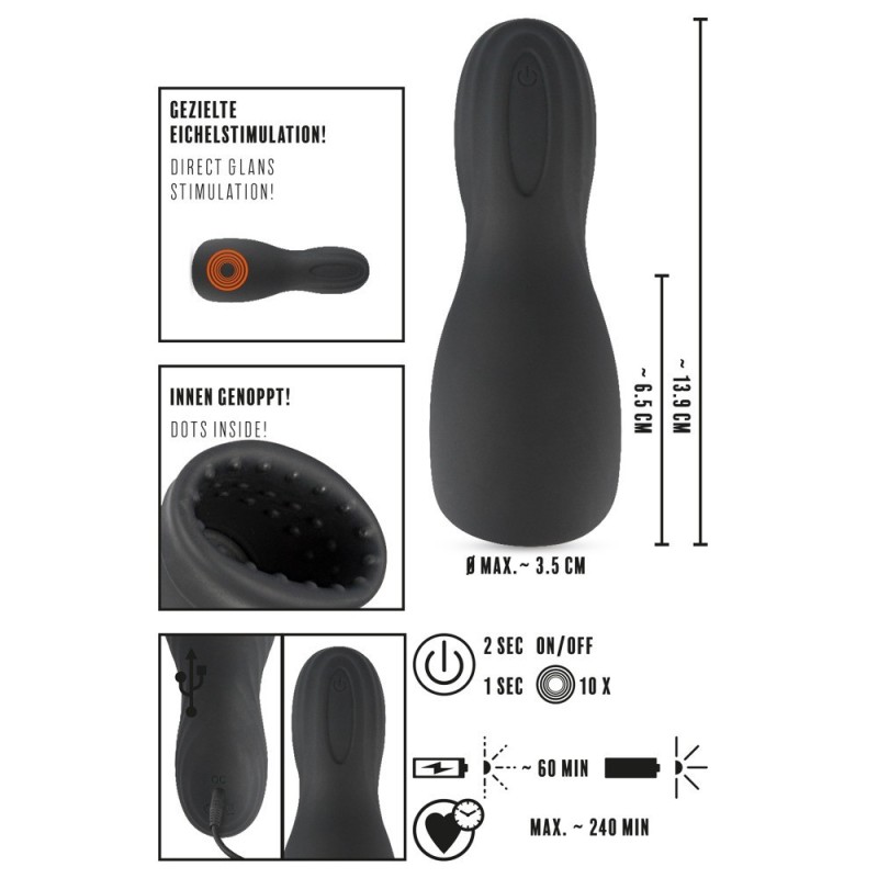 Maneggevole masturbatore compatto che coccola direttamente il glande e il frenulo con vibrazioni formicolanti e innumerevoli nodi morbidi. 10 modalità di vibrazione forniscono un sacco di varietà e sono comodamente controllate al tocco di un pulsante direttamente sul giocattolo. Rivestito tutto intorno con una texture vellutata e morbida al tatto, fornisce una piacevole sensazione di pelle durante la masturbazione. Con il suo piccolo formato maneggevole, questo leggero (99 g) si adatta anche a quasi tutte le tasche - perfetto per i quickies in movimento e in mezzo. Ricaricabile - cavo di ricarica USB incluso.