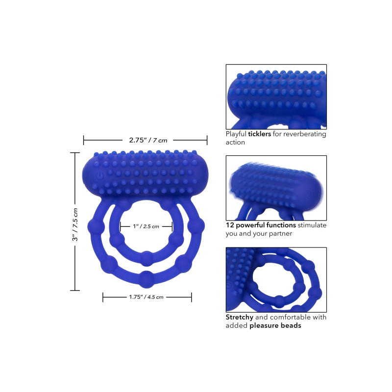 Raddoppiate il vostro piacere indossando l'anello in silicone ricaricabile 10 Bead Maximus. Questo anello elastico è rivestito di audaci perle di piacere e sormontato da un teaser che si agita al ritmo di 12 funzioni di vibrazione. L'anello in silicone morbido e sicuro per il corpo migliora la resistenza e la circonferenza per far gemere il vostro amante per avere di più, di più, di più. Il doppio anello elastico è rivestito da 10 perle strategicamente posizionate per massimizzare la sensibilità ed elevare la sensazione in tutto il pene per farvi godere di un piacere più lungo e potente. Mentre voi raggiungete un piacere di livello superiore, le 12 funzioni di vibrazione e il teaser borchiato lasceranno il vostro partner in uno stato di beatitudine orgasmica. Lo stimolatore sensualmente tempestato offre un piacere mirato ai punti più intimi. Inoltre, il design a doppio anello offre un supporto superiore all'erezione. Fate un tuffo in questo anello impermeabile e godetevi le potenti vibrazioni nella vasca da bagno o nella doccia. Questo appassionato cock ring ricorda esattamente come vi piace grazie al chip di memoria all'avanguardia e può riconoscere l'ultima funzione utilizzata. Utilizzate il pulsante in silicone easy-touch per controllare il piacere senza sforzo. Ricarica il tuo piacere in un attimo con un tempo di ricarica di 1,5 ore.