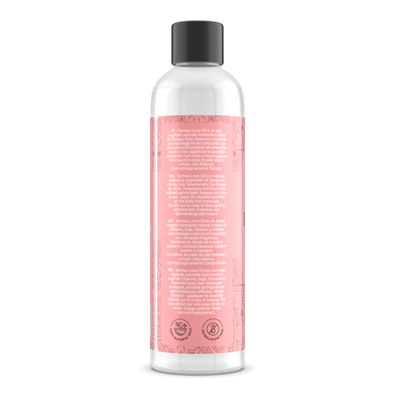 Tantras Love Oil, pleasure fruit è un olio per massaggi profumato con fragranza ai feromoni. L’esclusiva formulazione a base di pregiatissimi oli, unisce le proprietà sensuali a quelle eccitanti dei rari estratti essenziali, che si diffondono attraverso il massaggio. L’effetto degli estratti si diffonde nel corpo creando una nuova dimensione attraverso sensazioni stimolanti ed eccitanti, che assicurano una notevole carica di sensualità e di benessere. Olio per massaggi Con fragranza ai feromoni La fragranza ai feromoni di Tantras Love Oil, condurrà la coppia in una dimensione erotica e sensuale, stimolando la libido del partner grazie anche alle sue profumazioni coinvolgenti e seducenti. Afrodisiaco Per accendere la passione Arricchito con ricercate profumazioni afrodisiache, Tantras Love Oil accenderà la passione stimolando il desiderio sessuale rendendolo ancora più coinvolgente e sensuale. Le sue fragranze si diffondono nell'aria trasportando la coppia in una dimensione di benessere e passione. Ideale per il corpo Per una pelle morbida e setosa Grazie alla sua esclusiva formulazione a base di pregiatissimi oli, Tantras Love Oil garantisce la massima compatibilità anche con la pelle più sensibile, rendendola morbida e setosa dopo ogni suo utilizzo. Può essere inoltre utilizzato come olio dopo bagno per mantenere la pelle idrata e profumata.
